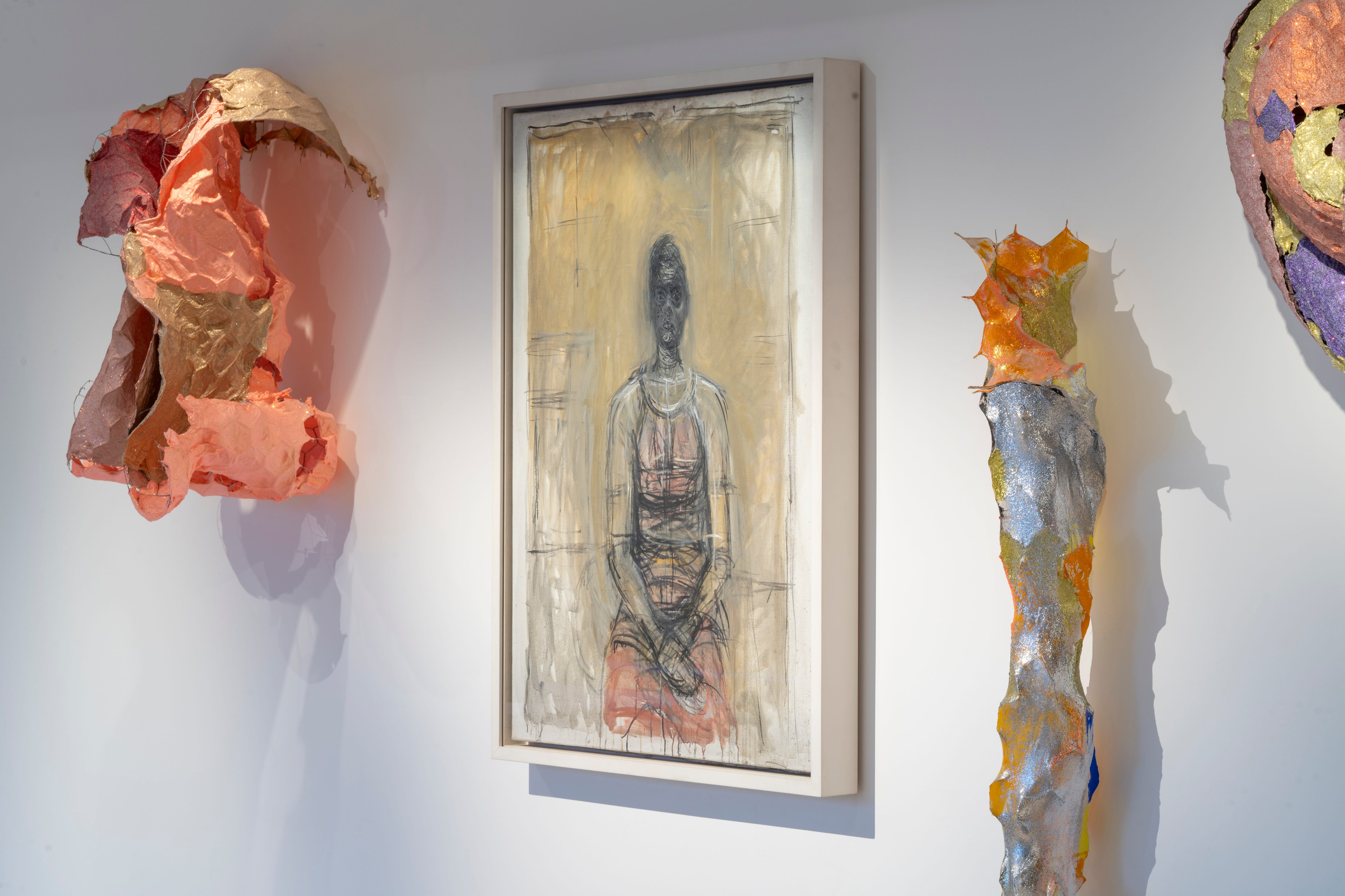 As the exhibition narrows, though, such harmony is abandoned as Benglis’s forms feel more akin to Memphis post-modernism – using painted sparkles, acrylic, watercolour, and coal tempera – than early twentieth-century techniques. These are the most exciting pieces by Benglis, which offer a return to the amorphous knots of her early career, covered in glitter and pastel paint, like chewing gum rolled up and spat out. Amongst them, the seeming solidity of Giacometti’s sculptures don’t quite fit, as they slip in-between the carnival of colour.